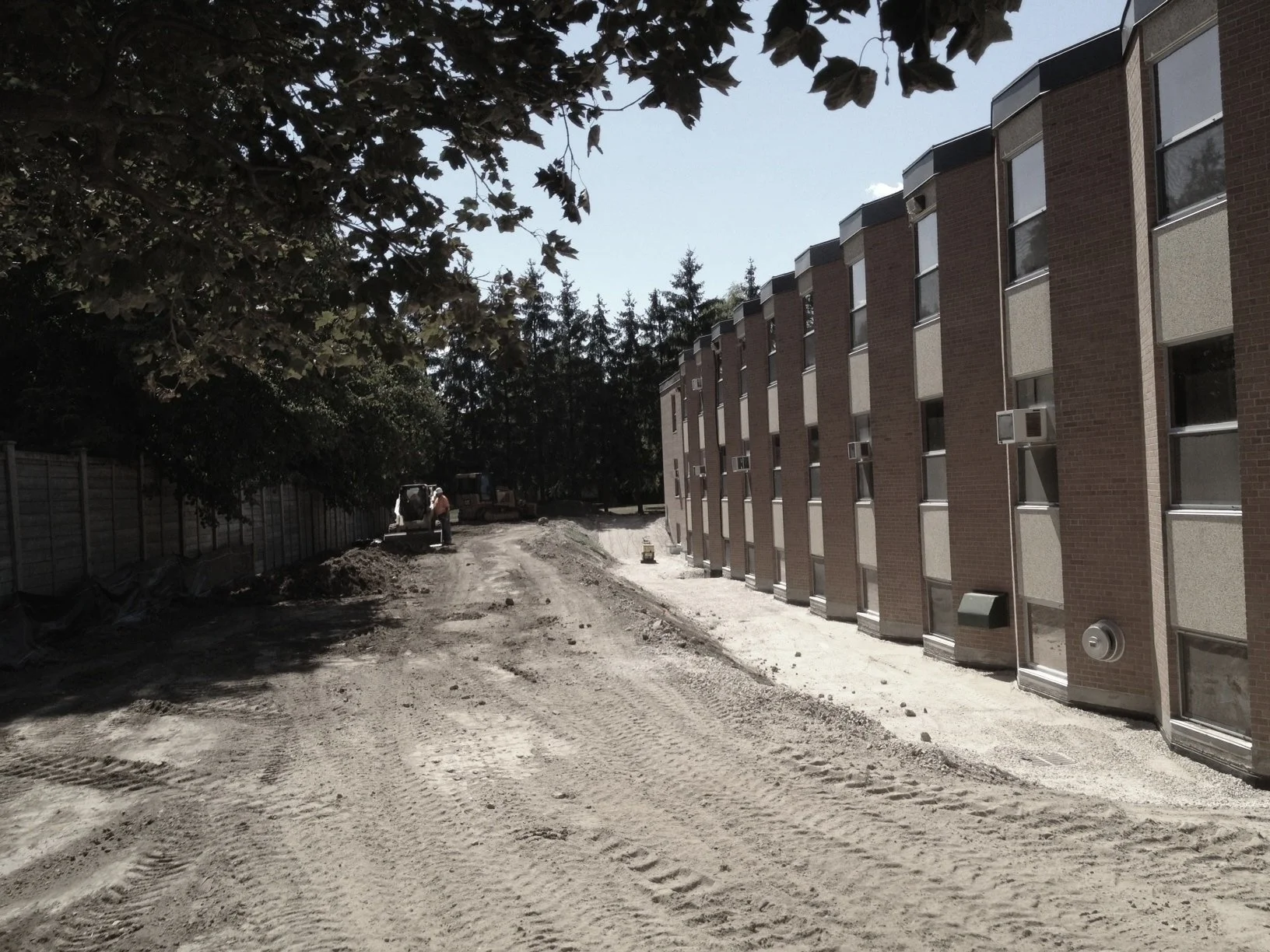 Foundation wall repairs and new waterproofing of a two story 18,000 sq. ft. building, including landscaping, new asphalt and concrete walkways